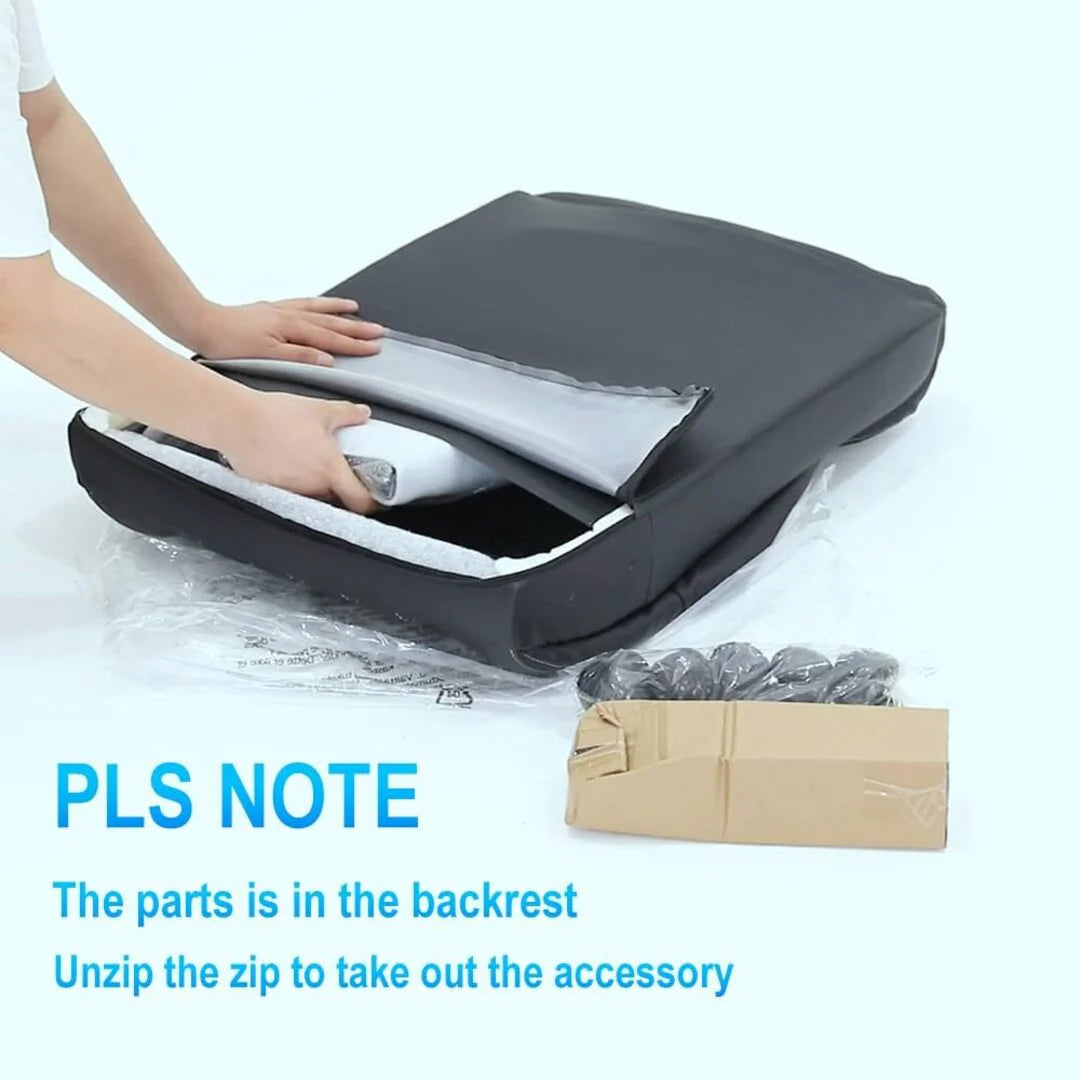 Assembly is a breeze with the included instructions. All components, including casters, base, arms, seat mechanism, and hardware kit, are conveniently packed in the back cushion for easy access and quick setup.