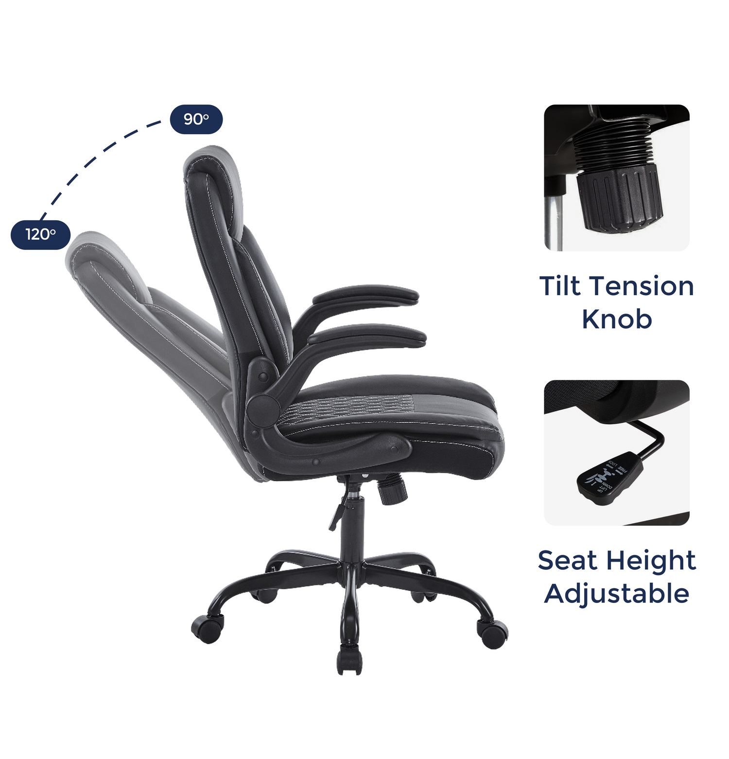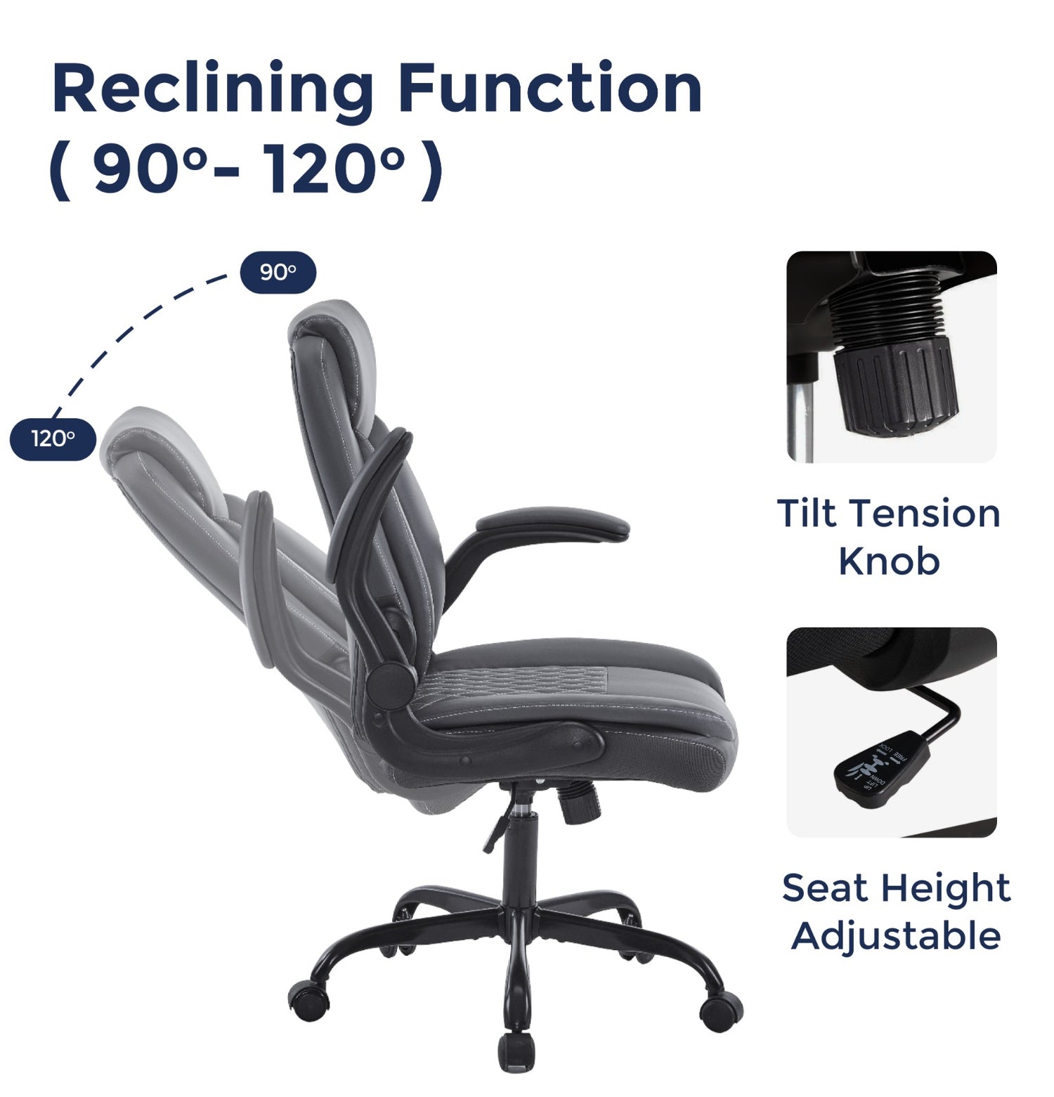- Smooth reclining range from 90° upright work position to 120° relaxed tilt